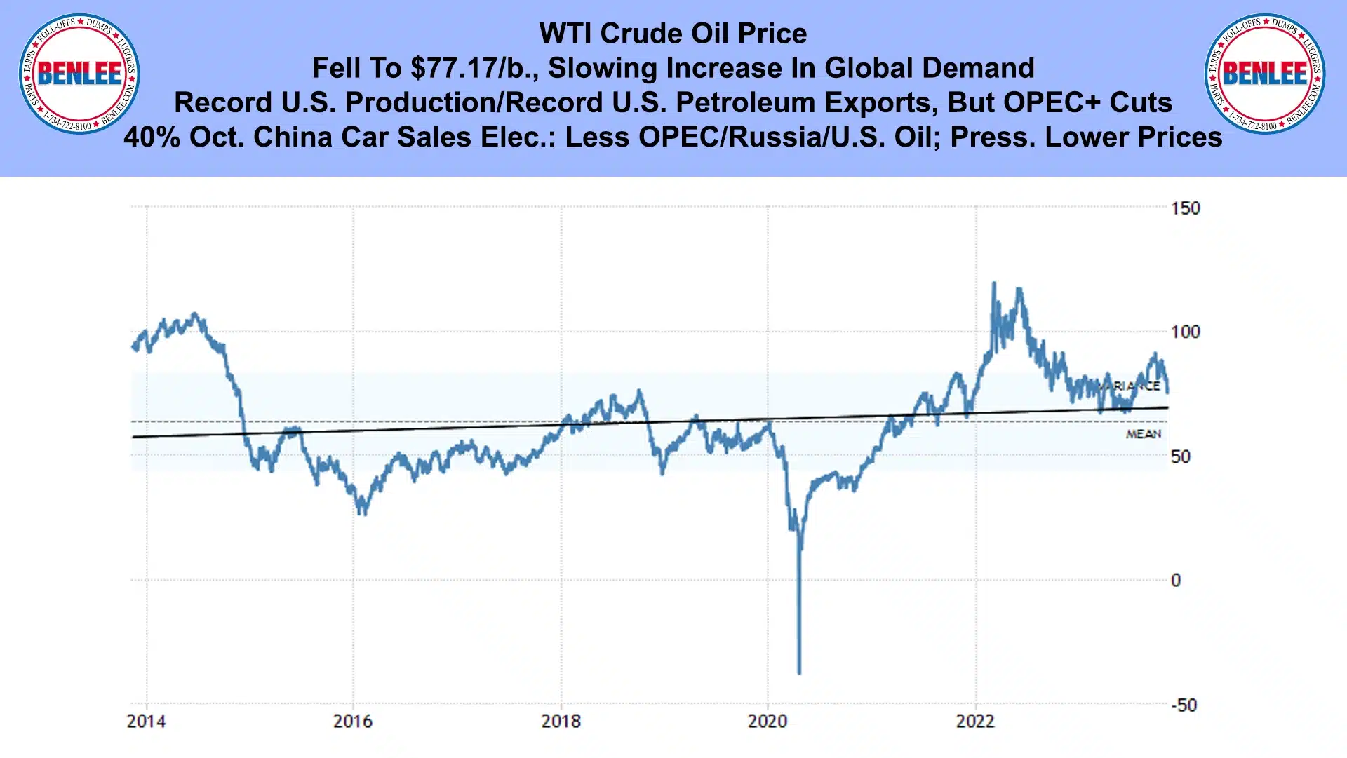 WTI crude oil price fell to $77.17/b., on the slowing increase in global demand. This was on record U.S. oil production, record U.S. petroleum exports, but OPEC+ production cuts. 40% of October Chinese new car sales were electric, so less OPEC, Russian and U.S. oil imports, which lowers prices.