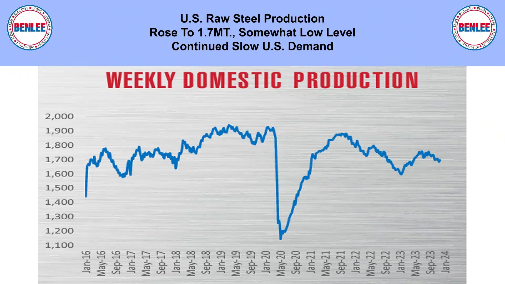 U.S. weekly raw steel production rose to 1.7MT a somewhat low level on continued slow U.S. demand.