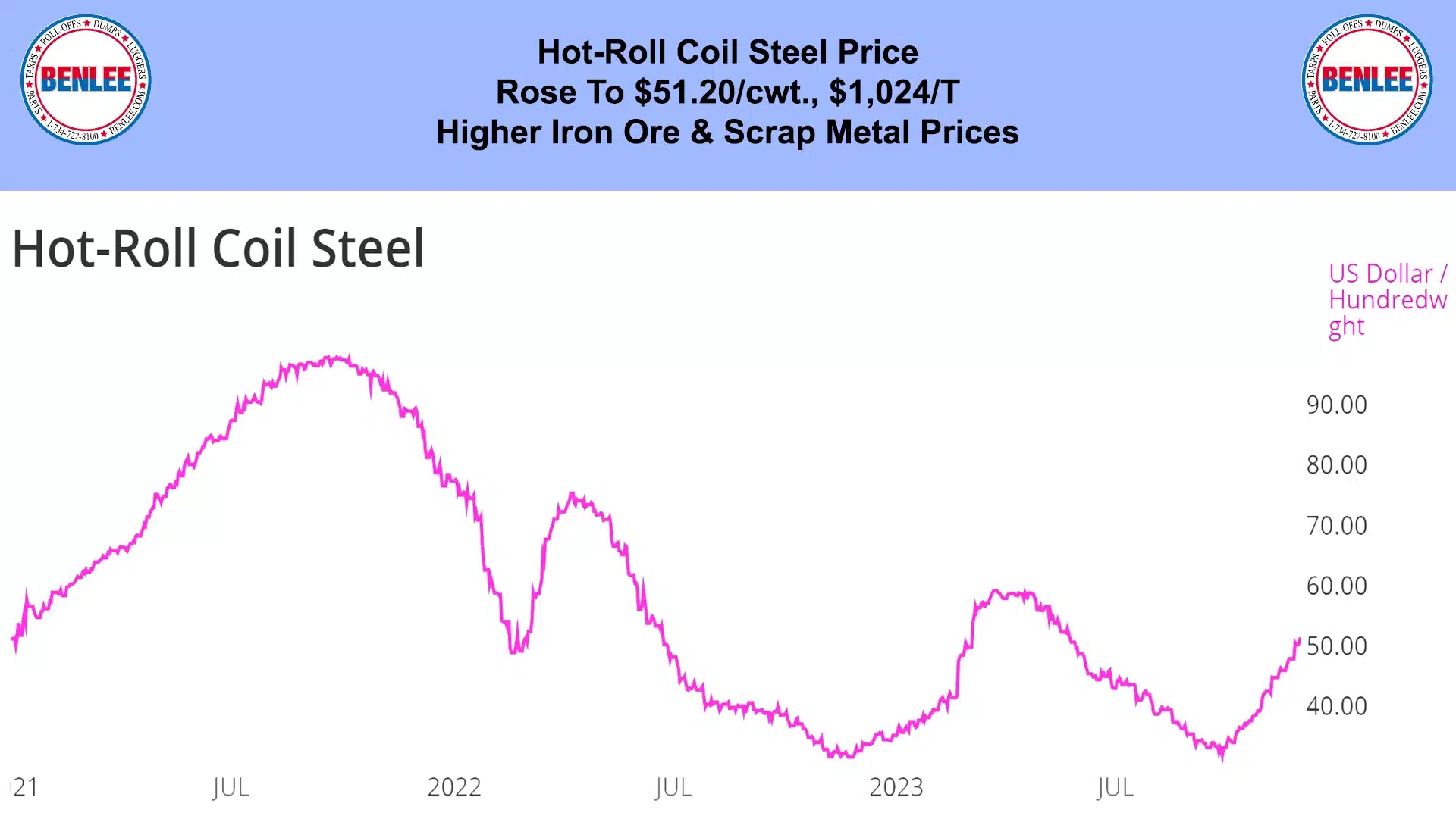 Hot-rolled coil steel price rose to $51.20/cwt., $1,024/T on higher iron ore and scrap metal prices.