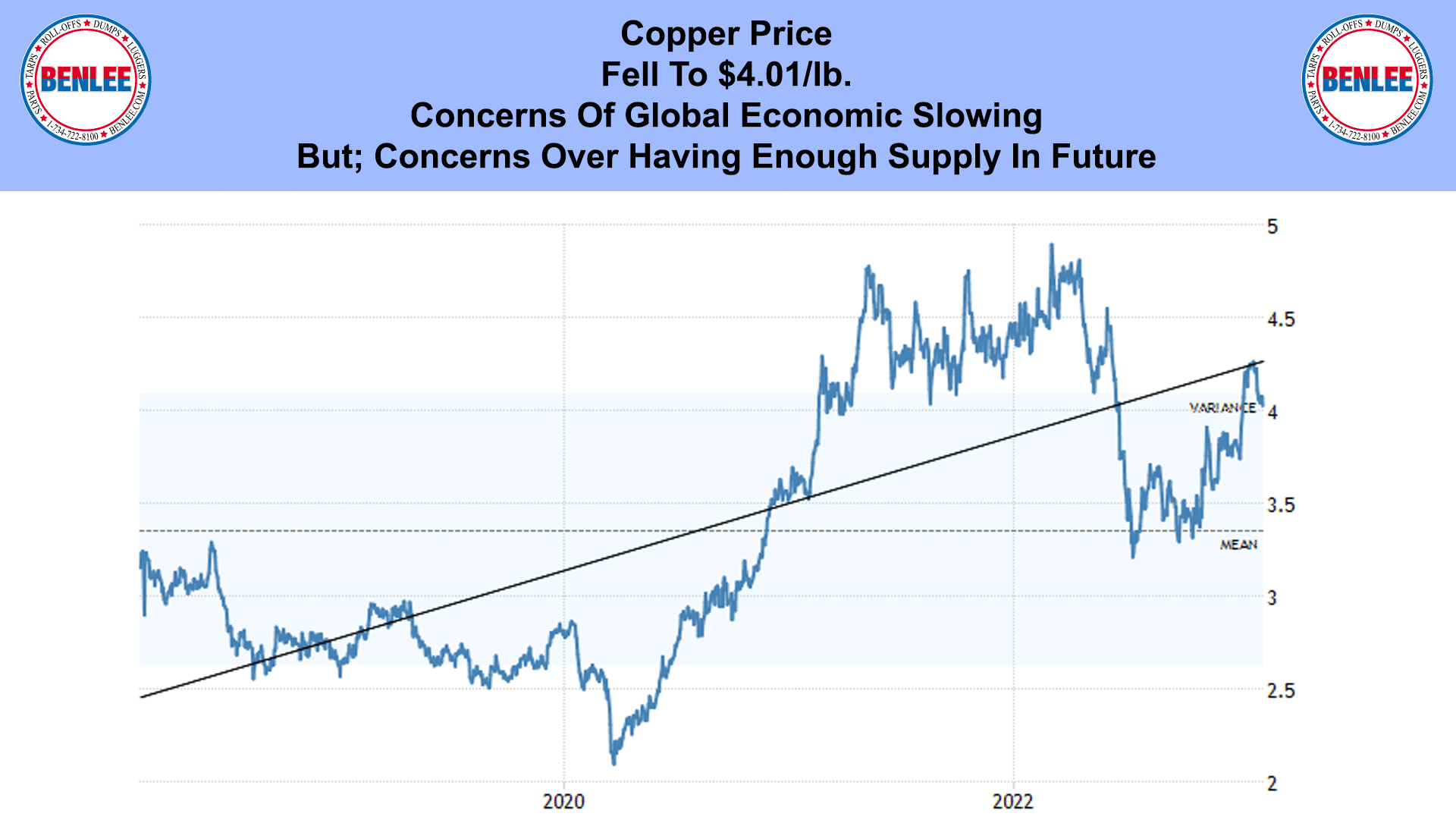 Copper price fell to $4.01/lb., on concerns of global economic slowing, but concerns over having enough supply in the future.