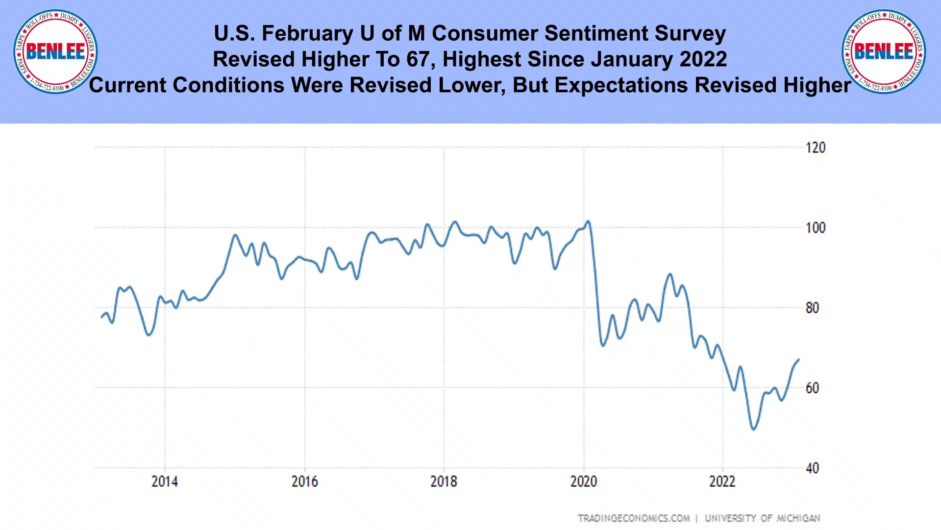 U.S. February U of M consumer sentiment survey was revised higher to 67, the highest since January 2022. Current conditions were revised lower, but expectation were revised higher.
