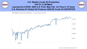 U.S. weekly crude oil production fell to 13.387Mb/d. Leaving out COVID 2025 U.S. production may fall for the first time in 10 years. The U.S. remains the #1 crude oil producer and the #2 crude oil exporter in the world.