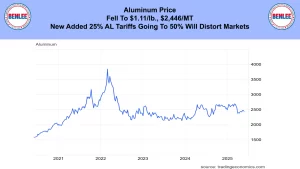 Aluminum price fell to $1.11/lb., $2,446/MT. The new added 25% aluminum tariffs, going to 50% will distort markets.