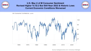 U.S. May U of M Consumer sentiment was revised higher but sill near 2022 and historic lows. Current economic conditions worsened.