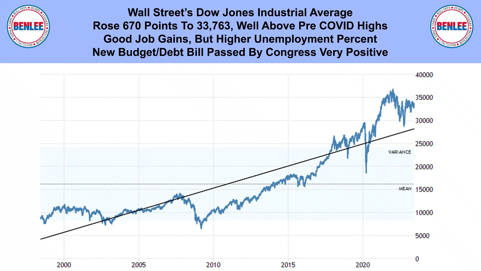 Wall Street’s Dow Jones Industrial Average rose 670 points to 33,763, well above pre COVID highs. This was on good job gains, but a higher unemployment percentage. Also, on the new budget/debt bill passed by congress, which was very positive.