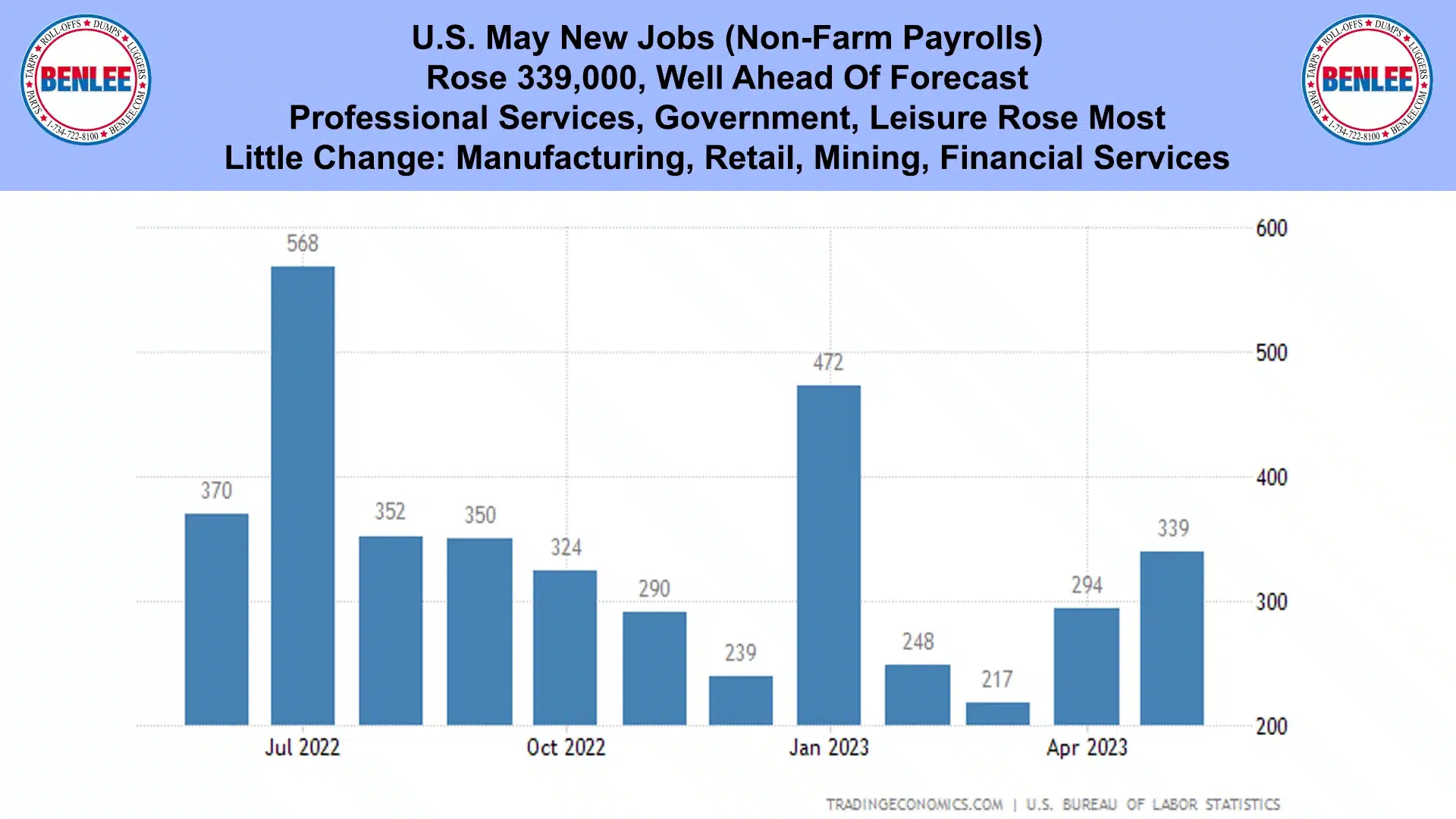 U.S. May new jobs, non-farm payroll. They rose to 339,000, well ahead of forecast. Professional services, government and leisure rose the most. There was little change in manufacturing, retail, mining, and financial services.