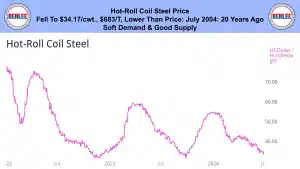 Hot-roll coil steel price fell to $34.17/cwt., $683/T. This is lower than the price of July 2004, about 20 years ago.