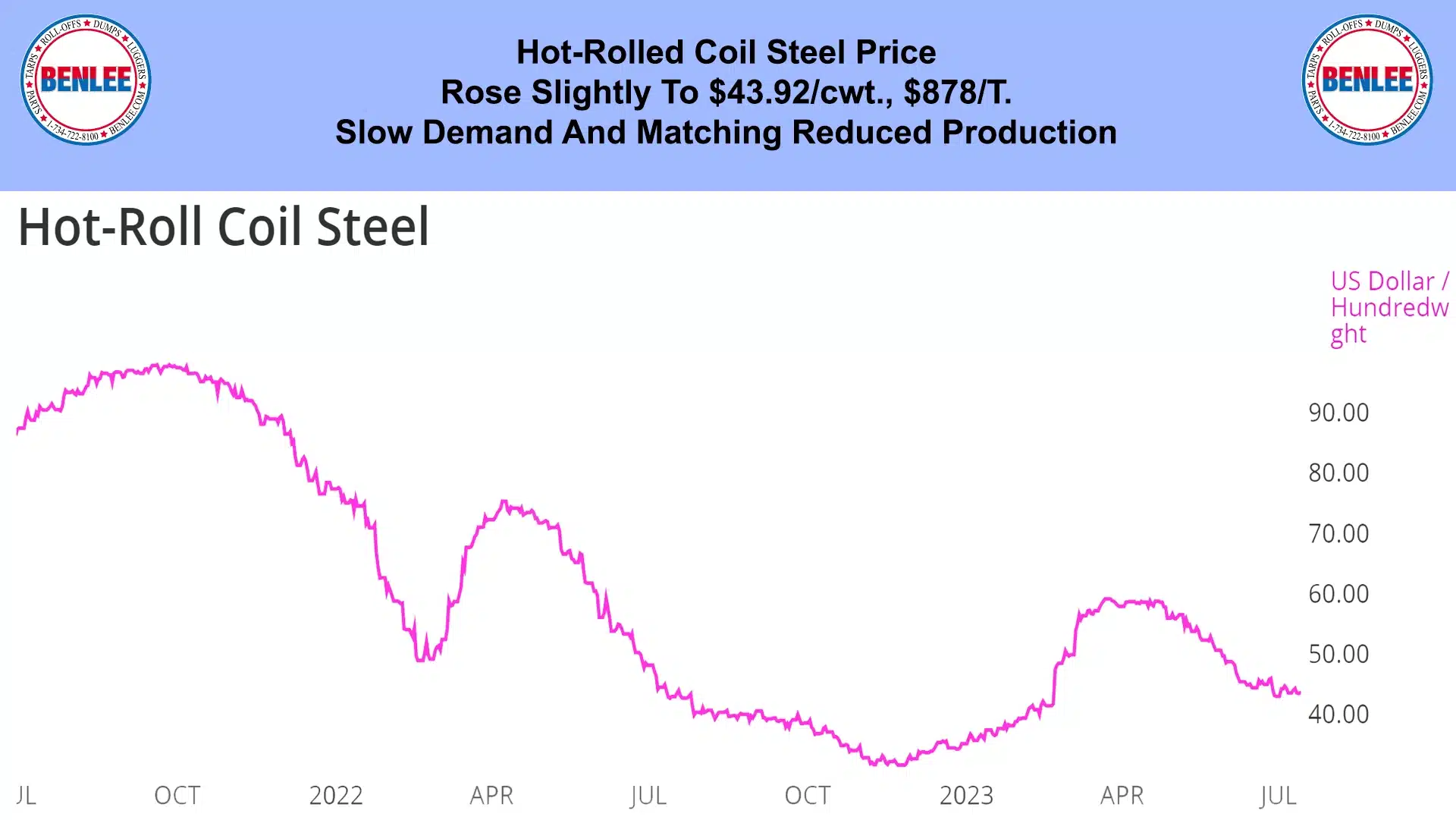 Hot-rolled coil steel price rose slightly to $43.92/cwt., $878/T on slow demand matched with reduced production.