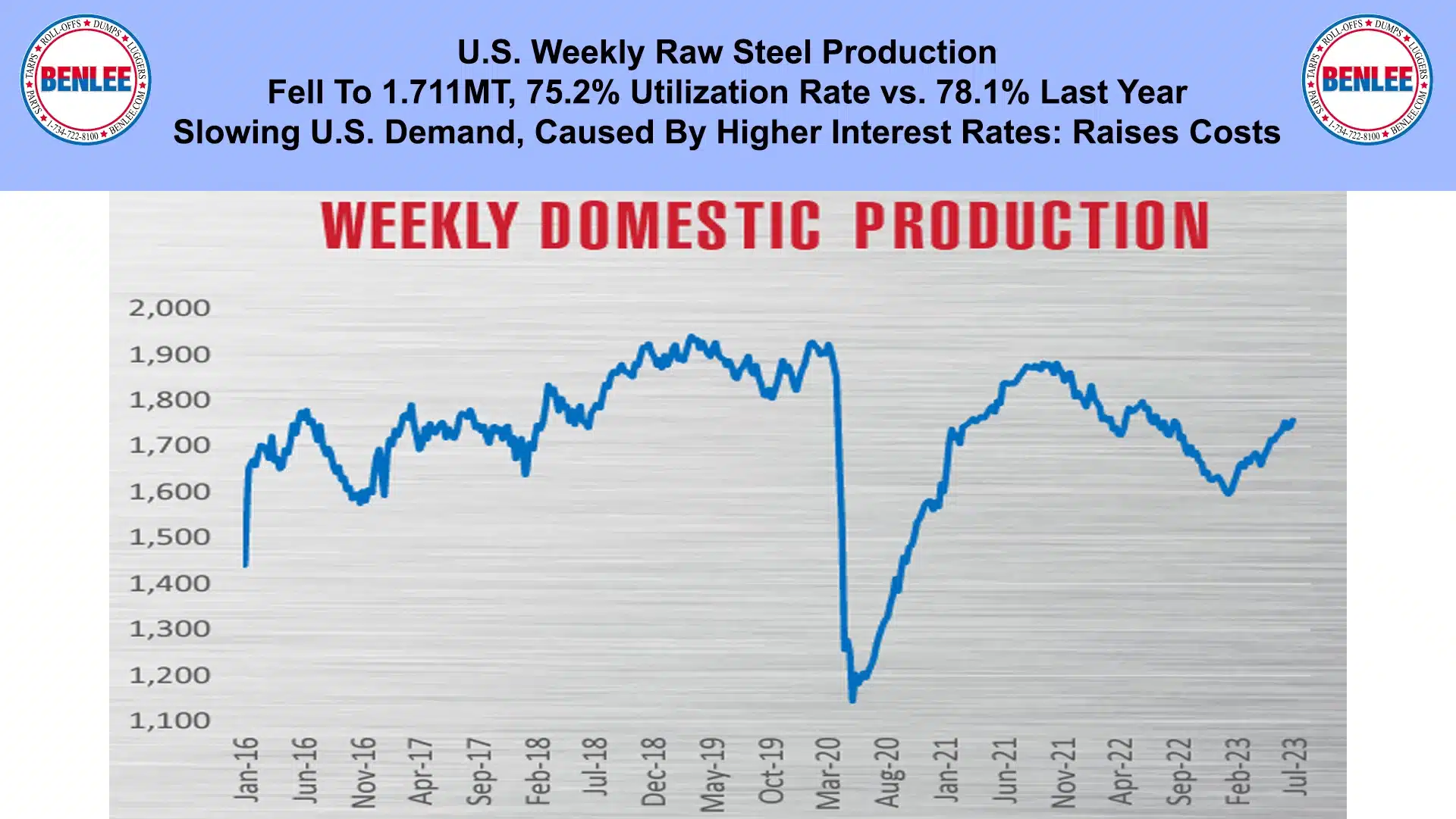 U.S. weekly raw steel production fell to 1.711MT, a 75.2% utilization rate, vs. 78.1% last year. This was on slowing U.S. demand caused by higher interest rates that raises the cost of doing business.