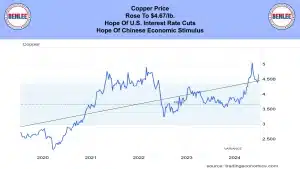 Copper price rose to $4.67/lb. on hope of U.S. interest rate cuts and hope of Chinese economic stimulus.