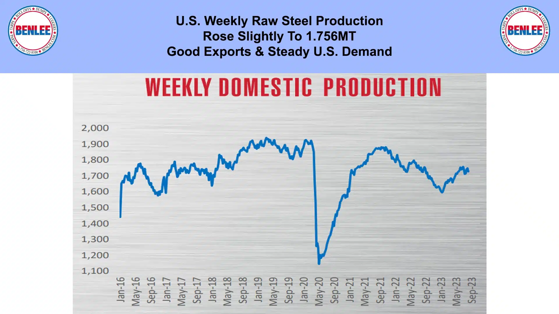 U.S. weekly raw steel production rose slightly to 1.756MT, on good exports and steady U.S. demand.