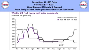 Scrap steel #1 HMS price composite remained steady at $311.67/GT on a good balance of supply and demand. Some scrap grades are under downward price pressure for October.