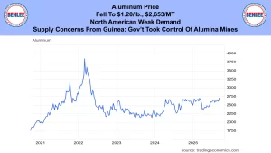Aluminum price fell to $1.20/lb., $2,653/MT on North American weakened demand. There have also been supply concerns from Guinea as the government took control of the country’s alumina mines.