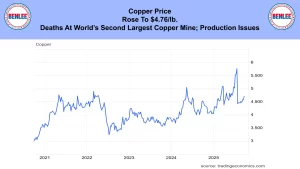 Copper price rose to $4.76/lb., on deaths at the world’s second largest copper mine which is causing production issues.