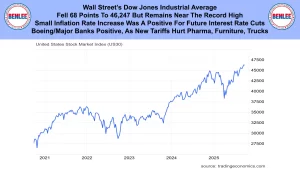 Wall Street’s Dow Jones Industrial Average fell 68 points to 46,247 but remaining near the record high. The small inflation rate increase was a positive for future interest rate cuts. Boeing and major banks were positive and the new tariffs hurt Pharmaceuticals, Furniture and Truck companies.