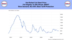 Hot-Rolled coil steel price fell slightly to $40.30/cwt., $806/T on slow demand, but the 50% tariff protection.
