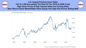 U.S. August existing home sales fell to 4.0M annualized, the rate of the 1970s and the 2008 crash. High home prices and high interest rates are hurting sales. The near record stock market and high home equity has high end homes selling fairly well though.