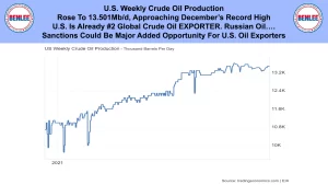 U.S. weekly crude oil production rose to 13.501Mb/d., approaching December’s record high. The U.S. is already the #2 global crude oil exporter, yes exporter of crude oil and Russian oil sanctions could be a major opportunity for U.S. oil exporters.