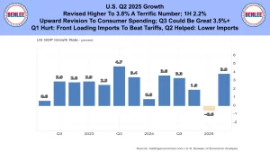 U.S. Q2 2025 growth was revised higher to 3.8% a terrific number which makes the 1H 2.2%. This was on the upward revision to consumer spending. Also, Q3 could be a great 3.5% or more. Q1 was hurt by front loading imports to beat tariffs. Q2 was helped by lower imports, due to the Q1 import surge.