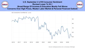 U.S. September U of M consumer sentiment was revised lower to 55.1. A broad range of income and education mostly felt worse. The concerns are over high prices, the weaker labor market and their personal financial outlook.