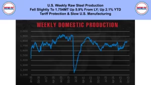 U.S. weekly raw steel production fell slightly to 1.754MT up 5.9% from last year and up 2.1% year to date. This was on tariff protection and slow U.S. manufacturing.