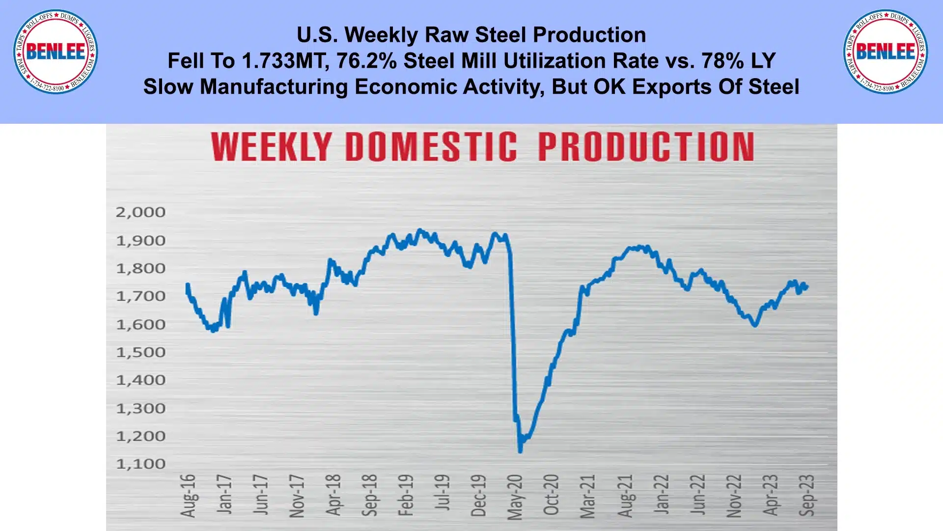 U.S. weekly raw steel production fell to 1.733MT a 76.2% steel mill utilization rate. This was on slow manufacturing economic activity, but OK exports of steel.