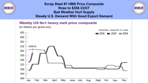Scrap steel #1 HMS price composite rose to $358.33/GT as bad weather hurt supply. Also, on steady U.S. demand with good export demand.