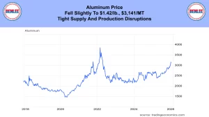 Aluminum price fell slightly to $1.42/lb., $3,141/MT on tight supply and production disruptions.