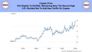 Copper price fell slightly to $5.85/lb., remaining near the record high as the U.S. decided not to add new tariffs on copper.