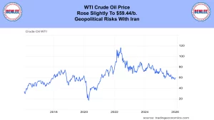WTI weekly crude oil price rose slightly to $59.44/b., on geopolitical risks with Iran.