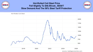 Hot-Rolled coil steel price fell slightly to $46.95/cwt., $939/T on slow demand and the 50% steel tariff protection.