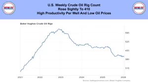 The U.S. weekly crude oil rig count rose slightly to 410. This was on high productivity per well and low oil prices.