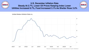 U.S. December inflation rate was steady at 2.7%, as lower oil prices are keeping the index lower. Utilities increased 6.7%, food increased 3.1% and shelter rose 3.2%.