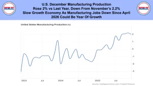 U.S. December manufacturing production rose 2% vs last year, but down from November’s 2.2% increase. This was on the slow growth economy as manufacturing jobs are down since April. 2026 could be the year of growth.