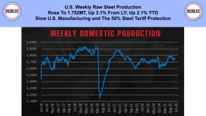 U.S. weekly raw steel production rose to 1.752MT up 3.1% from last year and up 2.1% year to date on slow U.S. manufacturing and 50% steel tariff protection.