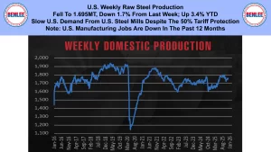 U.S. weekly raw steel production fell to 1.695MT down 1.7% from last week and up 3.4% year to date. This was on slow U.S. demand from U.S. Steel Mills despite the 50% steel tariff protection. Note that U.S. manufacturing jobs are down in past 12 months