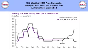 Scrap steel #1 HMS price composite was steady at $311.67/GT but is still in flux. This was as some steel grades fell.