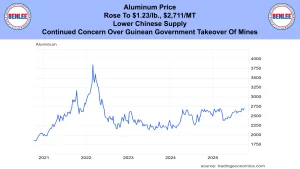 Aluminum price rose to $1.23/lb., $2,711/MT on lower Chinese supply. Also, on the continued concern over the Guinean government takeover of mines.