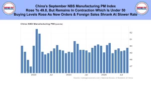 China’s September NBS manufacturing Purchasing Managers’ index rose to 49.8 but remains in contraction which is under 50. Buying levels rose as new orders and foreign sales shrank at a slower rate.