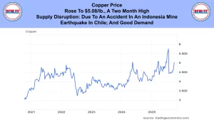 Copper price rose to $5.08/lb., a two month high on a supply disruption due to an accident in an Indonesian mine and an earthquake in Chile. There has remained good demand though.
