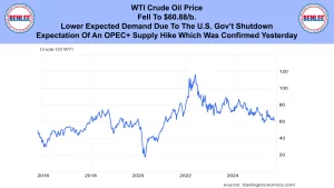 WTI crude oil price fell to $60.88/b on lower expected demand due to the U.S. government shutdown. Also, on the expectation of an OPEC+ supply hike, which was confirmed yesterday.