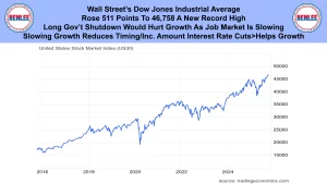Wall Street’s Dow Jones Industrial Average rose 511 points to 46,758 a new record high. A long government shutdown would hurt growth as the job market is slowing. Slowing growth reduces the timing and the amount of interest rate cuts that helps growth.