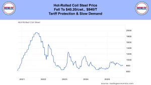 Hot-Rolled coil steel price fell to $40.20/cwt. $840/T on tariff protection and slow demand.