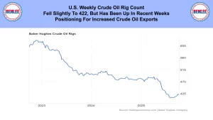 The U.S. weekly crude oil rig count fell slightly to 422 but has been up in recent weeks, positioning for increased crude oil exports.