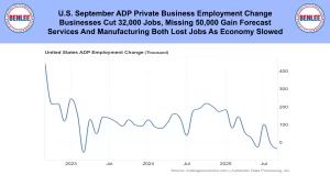 U.S. September ADP private business employment change. Businesses cut 32,000 jobs missing the 50,000 gain forecast. Services and manufacturing both lost jobs as the economy slowed.