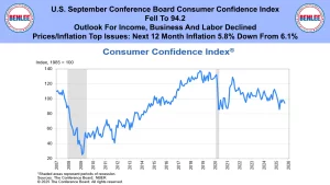 U.S. September conference board consumer confidence index, fell to 94.2. The outlook for income, business and labor declined. Prices and inflation were the top issues. The next 12 month inflation forecast was 5.8% down from 6.1%.