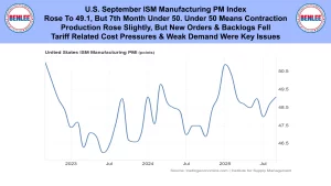 U.S. September ISM Manufacturing PM Index rose to 49.1, but it was the 7th month under 50. Under 50 means contraction. Production rose slightly, but new orders & backlogs fell. Tariff related cost pressures & weak demand were key issues.