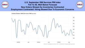 U.S. September ISM services purchasing managers’ index fell to 50 well below forecast. New orders slowed as inventories contracted. Employment contracted as hiring slowed due to economic concerns.