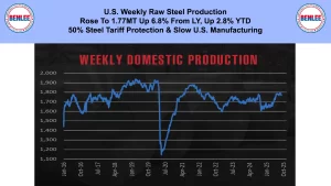 U.S. weekly raw steel production rose to 1.77MT up 6.8% from last year and up 2.8% year to date. This was on the 50% steel tariff protection and slow U.S. manufacturing.