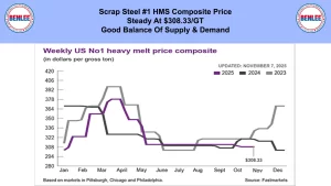 Scrap steel #1 HMS price composite was steady at $308.33/GT on a good balance of supply and demand.